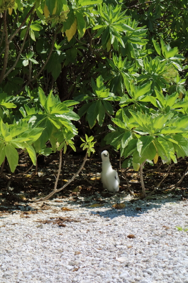 Previous Image Next Image 20170816 Tiarauunu (61) A brown booby chick peers at us from under a velvet tree (Heliotropium foertherianum or tohunu)