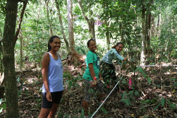 Undergraduate students from Mayalen Zubia’s ecology class at the University of French Polynesia establishing new subplots at the demonstration plot at Gump Station. A test of teamwork, logic and field skills which the students found challenging but ultimately rewarding.