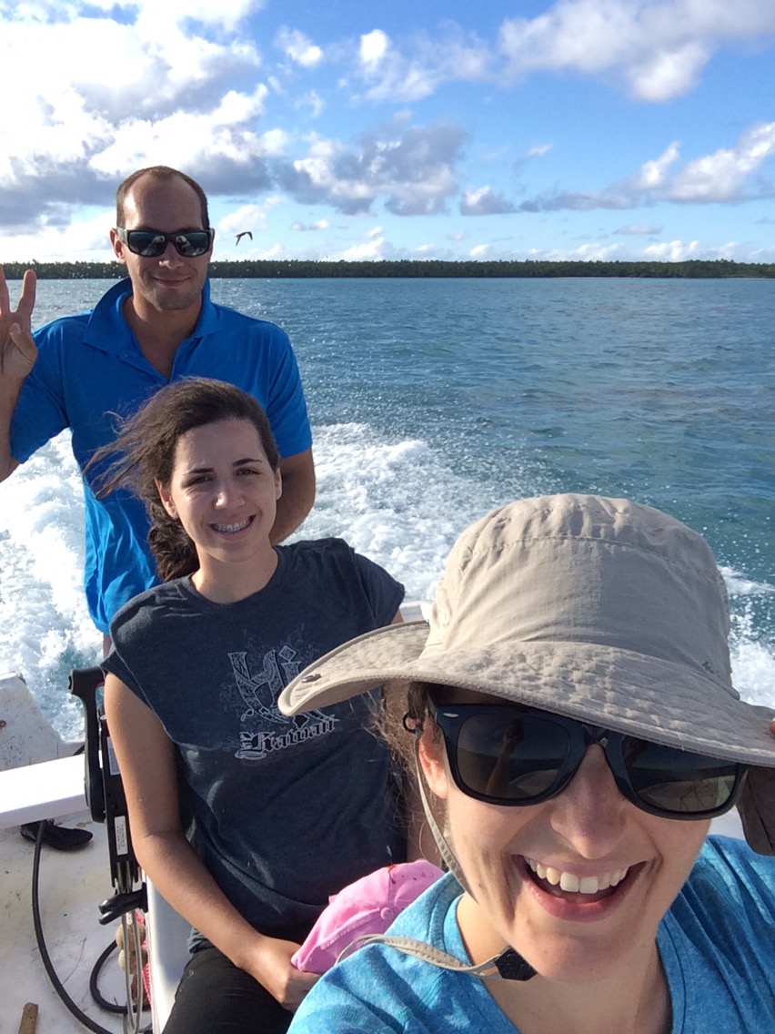 Moana, Heipoe and I (in my chapeau sexy/ very practical hat) are followed by frigate birds on the way home from a day out on Tiaraunu